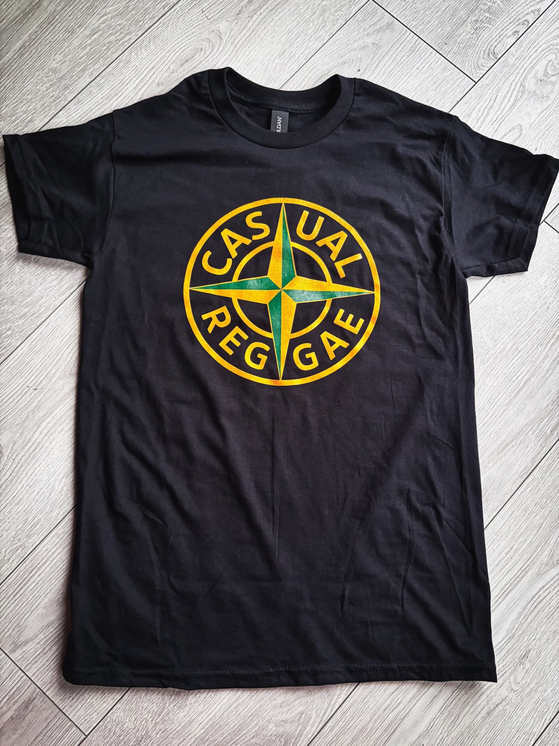 T-Shirt GILDAN Heavy 180gr, imprimé en jaune orangé et vert sur T-shirt Noir.